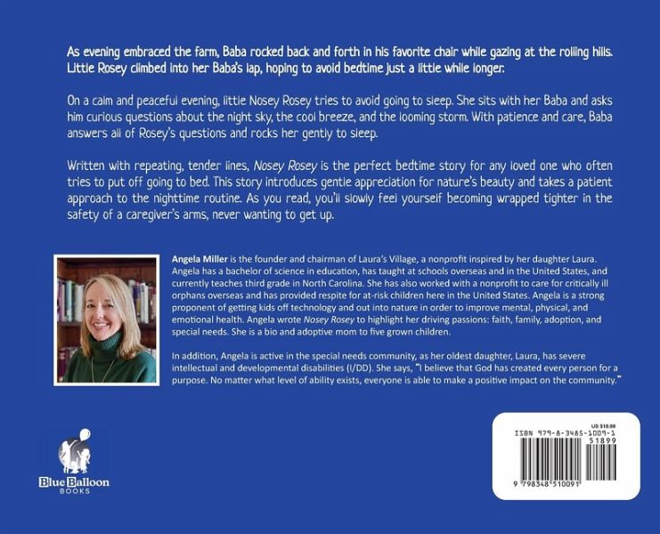 Angela Miller is the founder and chairman of Laura's Village, a nonprofit inspired by her daughter, Laura. Angela has a bachelor of science in education, has taught at schools overseas and in the United States, and currently teaches third grade in North Carolina. She has also worked with a nonprofit to care for critically ill orphans overseas and has provided respite for at-risk children here in the United States. Miller wrote Nosey Rosey to highlight her driving passions: faith, family, adoption, and special needs. She is a bio and adoptive mom to five grown children. In addition, Angela is active in the special needs community, as her oldest daughter, Laura, has severe intellectual and developmental disabilities (I/DD). She says, "I believe that God has created every person for a purpose. No matter what level of ability exists, everyone is able to make a positive impact on the community."