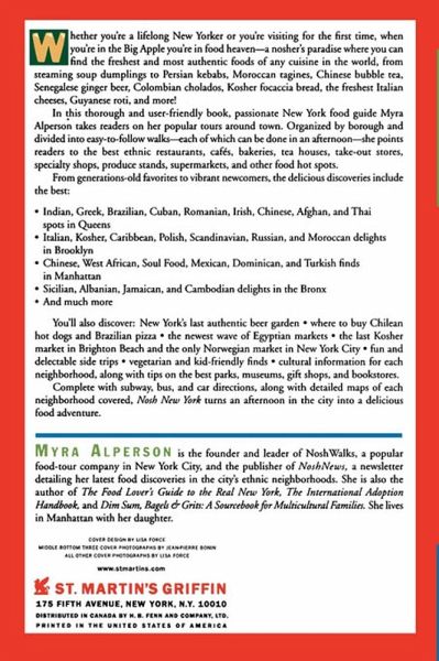 Whether you're a lifelong New Yorker or you're visiting for the first time, when you're in the Big Apple you're in food heaven - a nosher's paradise where you can find the freshest and most authentic foods of any cuisine in the world, from steaming soup dumplings to Persian Kebabs, Moroccan tagines, Chinese bubble tea, Senegalese ginger beer, Colombian cholados, kosher focaccia bread, the freshest Italian cheeses, Guyanese roti and more! In this thorough and user-friendly book, passionate New York food guide Myra Alperson takes readers on her popular tours around town. Organized by borough and divided into easy-to-follow walks -- each of which can be done in an afternoon -- she points readers to the best ethnic restaurants, cafes, bakeries, tea houses, take-out stores, specialty shops, produce stands, supermarkets, and other food hot spots. From generations-old favorites to vibrant newcomers, the delicious discoveries and include the best: - Indian, Greek, Brazilian, Cuban, Romanian, Irish, Chinese, Afghan and Thai spots in Queens - Italian, Kosher, Caribbean, Polish, Scandinavian, Russian and Moroccan delights in Brooklyn - Chinese, West African, Soul Food, Mexican, Dominican, Korean and Turkish finds in Manhattan - Sicilian, Albanian, Jamaican and Cambodian delights in the Bronx - And much more. You'll also discover: New York's last authentic beer garden * where to buy Chilean hot dogs and Brazilian pizza* the newest wave of Egyptian markets * the last Kosher market in Brighton Beach and the only Norwegian market in New York City * fun and delectable side trips * vegetarian and kid-friendly finds * cultural information for each neighborhood, along with info on the best parks, museums, gift shops, and bookstores. Complete with subway, bus, and car directions along with detailed maps of each neighborhood covered, Nosh New York turns an afternoon in the city into a delicious food adventure.