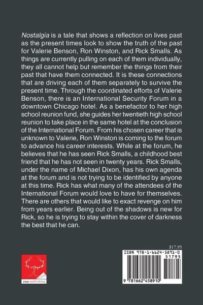 Nostalgia is a tale that shows a reflection on lives past as the present times look to show the truth of the past for Valerie Benson, Ron Winston, and Rick Smalls. As things are currently pulling on each of them individually, they all cannot help but remember the things from their past that have them connected. It is these connections that are driving each of them separately to survive the present time. Through the coordinated efforts of Valerie Benson, there is an International Security Forum in a downtown Chicago hotel. As a benefactor to her high school reunion fund, she guides her twentieth high school reunion to take place in the same hotel at the conclusion of the International Forum. From his chosen career that is unknown to Valerie, Ron Winston is coming to the forum to advance his career interests. While at the forum, he believes that he has seen Rick Smalls, a childhood best friend that he has not seen in twenty years. Rick Smalls, under the name of Michael Dixon, has his own agenda at the forum and is not trying to be identified by anyone at this time. Rick has what many of the attendees of the International Forum would love to have for themselves. There are others that would like to exact revenge on him from years earlier. Being out of the shadows is new for Rick, so he is trying to stay within the cover of darkness the best that he can.