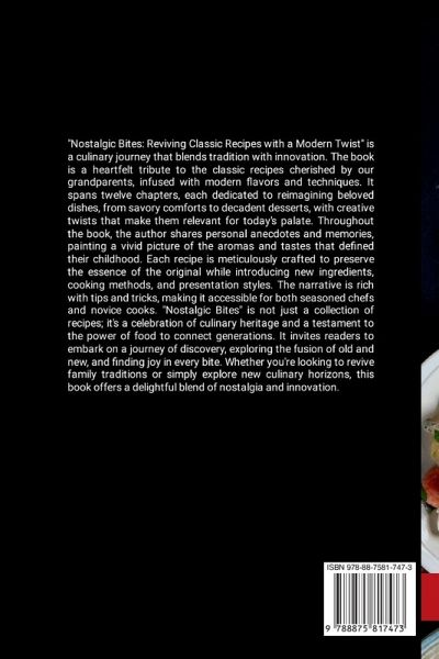 "Nostalgic Bites: Reviving Classic Recipes with a Modern Twist" is a culinary journey that blends tradition with innovation. The book is a heartfelt tribute to the classic recipes cherished by our grandparents, infused with modern flavors and techniques. It spans twelve chapters, each dedicated to reimagining beloved dishes, from savory comforts to decadent desserts, with creative twists that make them relevant for today's palate. Throughout the book, the author shares personal anecdotes and memories, painting a vivid picture of the aromas and tastes that defined their childhood. Each recipe is meticulously crafted to preserve the essence of the original while introducing new ingredients, cooking methods, and presentation styles. The narrative is rich with tips and tricks, making it accessible for both seasoned chefs and novice cooks. "Nostalgic Bites" is not just a collection of recipes; it's a celebration of culinary heritage and a testament to the power of food to connect generations. It invites readers to embark on a journey of discovery, exploring the fusion of old and new, and finding joy in every bite. Whether you're looking to revive family traditions or simply explore new culinary horizons, this book offers a delightful blend of nostalgia and innovation.