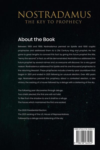 NOSTRADAMUS:THE KEY TO PROPHECY. Nostradamus, a sixteenth-century prophet from Salon, France, wrote that he had published one thousand prophecies that describe hundreds of years of history. He successfully wrote these prophecies decades and centuries before their fantastic fulfillment. Reincarnation is a hidden element in many of his quatrains. The distinctly human nature of the Messiah is another. Fifty-eight of his quatrains have been hidden to be retrieved by a future Christian king.This text is a legal argument presented to convince each of you, as jurors, that prophecy exists and can be verified through intense examination. Efforts were made during testimony to provide evidence to support these claims. Nostradamus indicated that, eventually, proof would be provided to this current generation in the form of a revelation. This evidence would be so conclusive; that at the conclusion of this trial, everyone would accept the truth that this examination has presented. Accordingly, over 300 successfully fulfilled prophecies were submitted to establish the astounding accuracy of his prophecies in their ability to foretell future events.This trial examined Nostradamus and his fulfilled prophecies, warning that his future prophecies would also be accomplished. These prophecies echo warnings found in the Old and New Testaments, including the book of Revelation. A contested 2020 Presidential Election, the 2021 sacking of the House of Representatives, a subsequent asteroid strike, and an ensuing conflict between Islam and Western cultures are foretold. In the concluding section, scripture was examined that confirmed reincarnation. These scriptures included biblical passages that establish the Creator's loathing of Islam and its false prophet.Religious statements by Nostradamus, concealed in his prophecies, were presented during testimony. These prophecies were included to demonstrate that Nostradamus intended that a hidden key would unlock not only his historically correct prophecies but also hidden prophecies in the Bible. Moreover, additional scripture established that the son of God, also known as the son of Man, has walked this earth in successive incarnations and is with us today and always.Testimony demonstrated that the Epistle of Nostradamus, and his 1000 prophecies, were written for, and dedicated to, the current incarnation of the Messiah. Nostradamus wrote his prophecies and epistle to awaken the Messiah to the hidden truths in the scriptures. So that he, in turn, could awaken all of you. Then, you, in turn, must awaken the world.