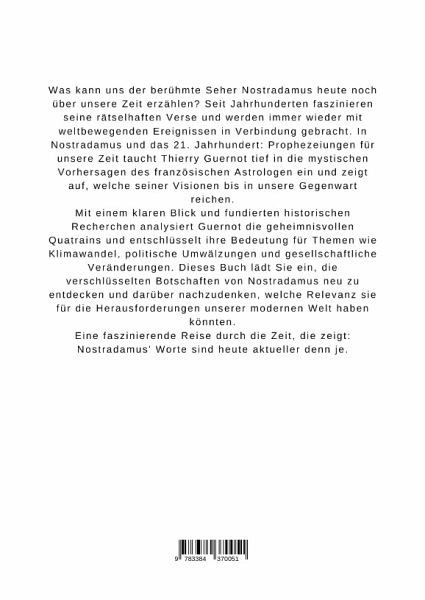 Was kann uns der berühmte Seher Nostradamus heute noch über unsere Zeit erzählen? Seit Jahrhunderten faszinieren seine rätselhaften Verse und werden immer wieder mit weltbewegenden Ereignissen in Verbindung gebracht. In Nostradamus und das 21. Jahrhundert: Prophezeiungen für unsere Zeit taucht Thierry Guernot tief in die mystischen Vorhersagen des französischen Astrologen ein und zeigt auf, welche seiner Visionen bis in unsere Gegenwart reichen.Mit einem klaren Blick und fundierten historischen Recherchen analysiert Guernot die geheimnisvollen Quatrains und entschlüsselt ihre Bedeutung für Themen wie Klimawandel, politische Umwälzungen und gesellschaftliche Veränderungen. Dieses Buch lädt Sie ein, die verschlüsselten Botschaften von Nostradamus neu zu entdecken und darüber nachzudenken, welche Relevanz sie für die Herausforderungen unserer modernen Welt haben könnten.Eine faszinierende Reise durch die Zeit, die zeigt: Nostradamus' Worte sind heute aktueller denn je.