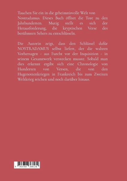 Tauchen Sie ein in die geheimnisvolle Welt von Nostradamus. Dieses Buch öffnet die Tore zu den Jahrhunderten. Mutig stellt es sich den Herausforderung, die kryptischen Verse des berühmten Sehers zu entschlüsseln. Die Autorin zeigt, dass den Schlüssel dafür NOSTRADAMUS selbst liefert, der die wahren Vorhersagen - aus Furcht vor der Inquisition - in seinem Gesamtwerk verstecken musste. Sobald man dies erkennt ergibt sich eine Chronologie von Hunderten von Versen, die von den Hugenottenkriegen in Frankreich bis zum Zweiten Weltkrieg reichen und noch darüber hinaus.