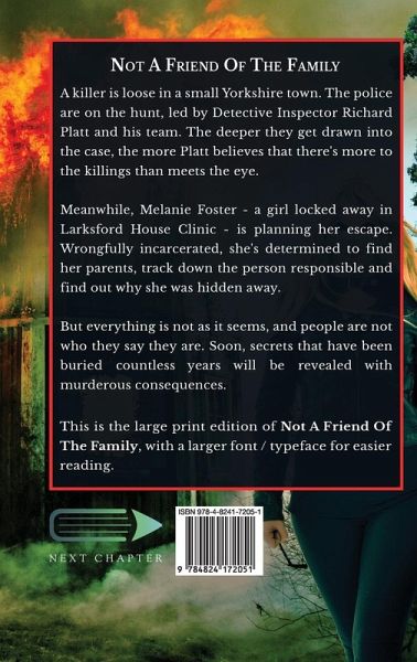 A killer is loose in a small Yorkshire town. The police are on the hunt, led by Detective Inspector Richard Platt and his team. The deeper they get drawn into the case, the more Platt believes that there's more to the killings than meets the eye. Meanwhile, Melanie Foster - a girl locked away in Larksford House Clinic - is planning her escape. Wrongfully incarcerated, she's determined to find her parents, track down the person responsible and find out why she was hidden away. But everything is not as it seems, and people are not who they say they are. Soon, secrets that have been buried countless years will be revealed with murderous consequences. This is the large print edition of Not A Friend Of The Family, with a larger font / typeface for easier reading.