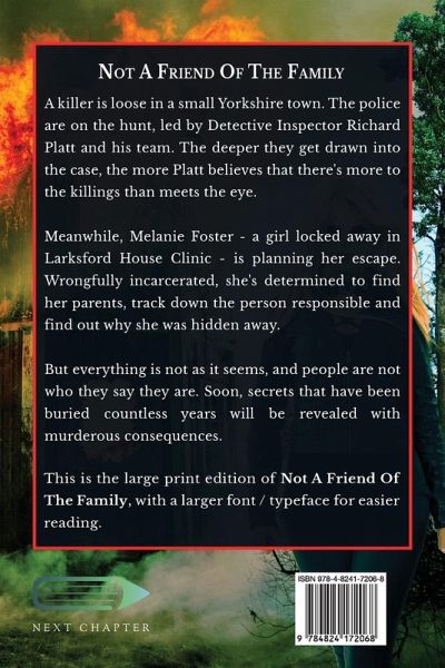A killer is loose in a small Yorkshire town. The police are on the hunt, led by Detective Inspector Richard Platt and his team. The deeper they get drawn into the case, the more Platt believes that there's more to the killings than meets the eye. Meanwhile, Melanie Foster - a girl locked away in Larksford House Clinic - is planning her escape. Wrongfully incarcerated, she's determined to find her parents, track down the person responsible and find out why she was hidden away. But everything is not as it seems, and people are not who they say they are. Soon, secrets that have been buried countless years will be revealed with murderous consequences. This is the large print edition of Not A Friend Of The Family, with a larger font / typeface for easier reading.
