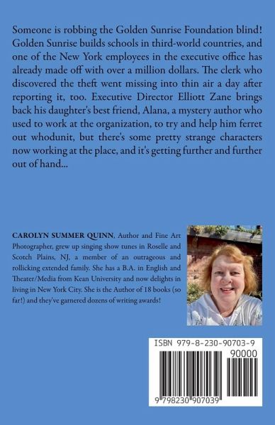 Someone is robbing the Golden Sunrise Foundation blind! Golden Sunrise builds schools in third-world countries, and one of the New York employees in the executive office has already made off with over a million dollars. The clerk who discovered the theft went missing into thin air a day after reporting it, too. Executive Director Elliott Zane brings back his daughter's best friend, Alana, a mystery author who used to work at the organization, to try and help him ferret out whodunit, but there's some pretty strange characters now working at the place, and it's getting further and further out of hand...