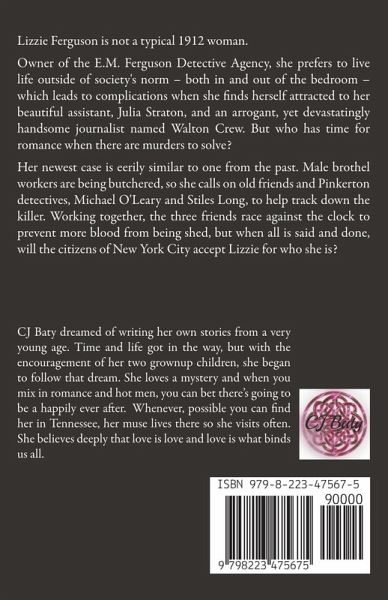 Lizzie Ferguson is not a typical 1912 woman. Owner of the E.M. Ferguson Detective Agency, she prefers to live life outside of society's norm – both in and out of the bedroom – which leads to complications when she finds herself attracted to her beautiful assistant, Julia Straton, and an arrogant, yet devastatingly handsome journalist named Walton Crew. But who has time for romance when there are murders to solve? Her newest case is eerily similar to one from the past. Male brothel workers are being butchered, so she calls on old friends and Pinkerton detectives, Michael O'Leary and Stiles Long, to help track down the killer. Working together, the three friends race against the clock to prevent more blood from being shed, but when all is said and done, will the citizens of New York City accept Lizzie for who she is?