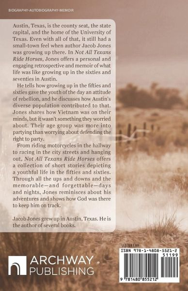 Austin, Texas, is the county seat, the state capital, and the home of the University of Texas. Even with all of that, it still had a small-town feel when author Jacob Jones was growing up there. In Not All Texans Ride Horses, Jones offers a personal and engaging retrospective and memoir of what life was like growing up in the sixties and seventies in Austin. He tells how growing up in the fifties and sixties gave the youth of the day an attitude of rebellion, and he discusses how Austin's diverse population contributed to that. Jones shares how Vietnam was on their minds, but it wasn't something they worried about. Their age group was more into partying than worrying about defending the right to party. From riding motorcycles in the hallway to racing in the city streets and hanging out, Not All Texans Ride Horses offers a collection of short stories depicting a youthful life in the fifties and sixties. Through all the ups and downs and the memorable-and forgettable-days and nights, Jones reminisces about his adventures and shows how God was there to keep him on track.