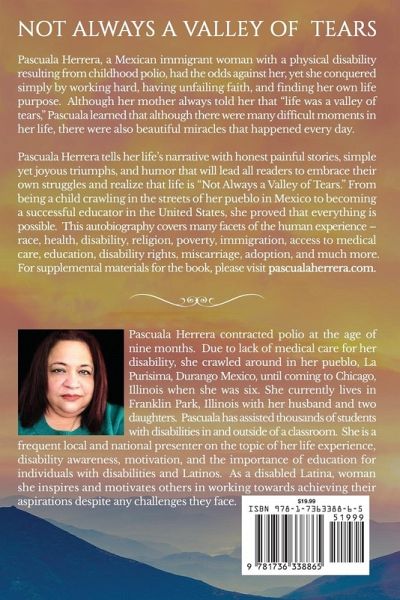Pascuala Herrera, a Mexican immigrant woman with a physical disability resulting from childhood polio, had the odds against her, yet she conquered simply by working hard, having unfailing faith, and finding her own life purpose. Although her mother always told her that "life was a valley of tears," Pascuala learned that although there were many difficult moments in her life, there were also beautiful miracles that happened every day. Pascuala Herrera tells her life's narrative with honest painful stories, simple yet joyous triumphs, and humor that will lead all readers to embrace their own struggles and realize that life is "Not Always a Valley of Tears." From being a child crawling in the streets of her pueblo in Mexico to becoming a successful educator in the United States, she proved that everything is possible. This autobiography covers many facets of the human experience - race, health, disability, religion, poverty, immigration, access to medical care, education, disability rights, miscarriage, adoption, and much more. For supplemental materials for the book, please visit pascualaherrera.com.