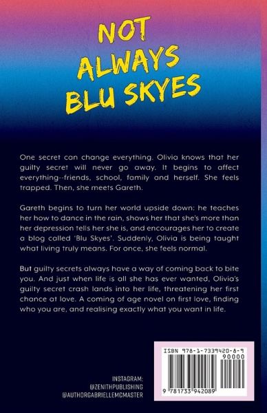 One secret can change everything. Olivia knows that her guilty secret will never go away, and it begins to affect everything: friends, school, family, and herself. She feels trapped. That's when she meets Gareth. Gareth turns her world upside down from teaching her how to dance in the rain, showing her that she's more than her depression, and encouraging her to create a blog called "Blu Skyes." Suddenly, Olivia is being taught what living truly means. For once, she feels normal. But the past always has a way of coming back to bite you. Just when life is all she has ever wanted, Olivia's guilty secret crash lands into her life, threatening her first chance at love. Not Always Blu Skyes is a coming of age novel on first love, finding who you are, and realising exactly what you want in life.
