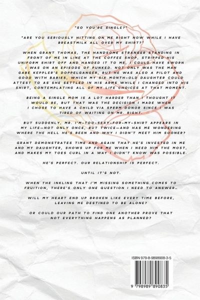 "So you're single?" "Are you seriously hitting on me right now while I have breastmilk all over my shirt?" When Grant Thomas, the handsome stranger standing in front of me in line at the coffee shop, stripped his uniform shirt off and handed it to me, I could have sworn I was on an episode of Punked. Not only was the man Gabe Kapler's doppelganger, but he was also a pilot and good with babies, which my six month-old daughter could attest to as she settled in his arms while I changed into his shirt, contemplating all of my life choices at that moment. Being a single mom is a lot harder than I thought it would be, but that was the decision I made when I chose to have a child via sperm donor since I was tired of waiting on Mr. Right. But suddenly, Mr. I'm-Too-Sexy-for-my-Shirt appears in my life-not only once, but twice-and has me wondering where the hell he's been and why I didn't meet him sooner? Grant demonstrates time and again that he's invested in me and my daughter, shows up for me when I need him the most, and makes my toes curl in a way I didn't know was possible. He's perfect. Our relationship is perfect. Until it's not. When the inkling that I'm missing something comes to fruition, there's only one question I need to answer... Will my heart end up broken like every time before, leaving me destined to be alone? Or could our path to find one another prove that not everything happens as planned?