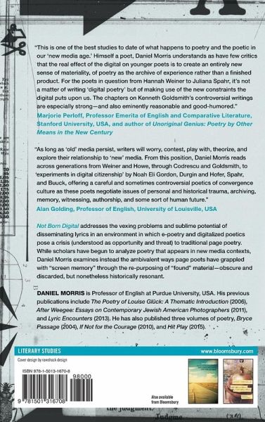 Not Born Digital addresses from multiple perspectives - ethical, historical, psychological, conceptual, aesthetic - the vexing problems and sublime potential of disseminating lyrics, the ancient form of transmission and preservation of the human voice, in an environment in which e-poetry and digitalized poetics pose a crisis (understood as opportunity and threat) to traditional page poetry. The premise of Not Born Digital is that the innovative contemporary poets studied in this book engage obscure and discarded, but nonetheless historically resonant materials to unsettle what Charles Bernstein, a leading innovative contemporary U.S. poet and critic of "official verse culture," refers to as "frame lock" and "tone jam." While other scholars have begun to analyze poetry that appears in new media contexts, Not Born Digital concerns the ambivalent ways page poets (rather than electronica based poets) have grappled with "screen memory" (that is, electronic and new media sources) through the re-purposing of "found" materials.
