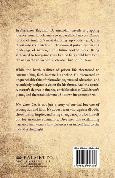 From the Halls of Prison to the Pinnacle of Wall Street: A Tale of Resilience, Faith, and the Undying Power of Second Chances. In Not. Dark. Yet., Iran D. Amandah shares an autobiography that shines a light on life's profound capacity for change, renewal, and unparalleled growth. Raised by a single mother in one of the nation's most notorious zip codes, 53206, Iran found himself incarcerated at the tender age of sixteen. It was a world where futures dimmed and hopes were extinguished. But not for Iran. Emerging 13 years later, he could have succumbed to the bleak forecast of recidivism that ensnares many. Instead, he chose to rewrite his narrative. With unyielding perseverance, he forged a path through higher education, reaching the zenith of success-a master's in finance and positions at Wall Street's elite institutions. Ultimately, Iran realized his dream by launching his very own investment management firm. Not. Dark. Yet. stands as a beacon of hope, demonstrating the power of faith, self-accountability, and an undying spirit. It serves as a testament that our past does not define us; rather, our actions, choices, and the faith we harbor light the way forward. Perfect for readers inspired by transformative personal stories and those interested in criminal justice reform, this memoir is a must-read. Dive deep into this tale of resilience and witness how one man defied the odds, reshaped his destiny, and emerged not just as a success but as a beacon of hope for many.