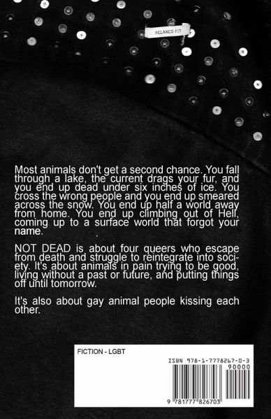 Most animals don't get a second chance. You fall through a lake, the current drags your fur, and you end up dead under six inches of ice. You cross the wrong people and you end up smeared across the snow. You end up half a world away from home. You end up climbing out of Hell, coming up to a surface world that forgot your name. NOT DEAD is about four queers who escape from death and struggle to reintegrate into society. It's about animals in pain trying to be good, living without a past or future, and putting things off until tomorrow. It's also about gay animal people kissing each other.
