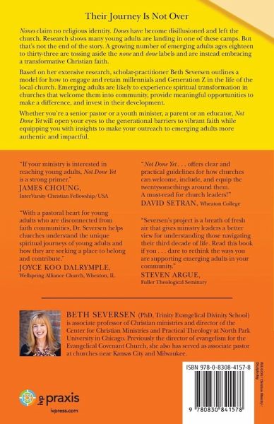 Nones claim no religion. Dones have become disillusioned and left the church. Research shows many young adults are landing in one of these camps. But that's not the end of the story. Many emerging adults, ages eighteen to thirty-three, are tossing aside the none and done labels and are instead embracing a transformative Christian faith. Based on her extensive research, scholar-practitioner Beth Seversen outlines a model for how to engage and retain millennials and Generation Z in the life of the local church. Emerging adults are likely to experience spiritual transformation in churches that welcome them into community, provide meaningful opportunities to make a difference, and invest in their development. Whether you're a senior pastor or a youth minister, a parent or an educator, Not Done Yet will open your eyes to the generational barriers to vibrant faith while equipping you with insights to make your outreach to emerging adults more authentic and impactful.