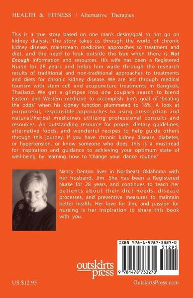 This is a true story based on one man's desire/goal to not go on kidney dialysis. The story takes us through the world of chronic kidney disease, mainstream medicine's approaches to treatment and diet, and the need to look outside the box when there is Not Enough information and resources. His wife has been a Registered Nurse for 28 years and helps him wade through the research results of traditional and non-traditional approaches to treatments and diets for chronic kidney disease. We are led through medical tourism with stem cell and acupuncture treatments in Bangkok, Thailand. We get a glimpse into one couple's search to blend Eastern and Western medicine to accomplish Jim's goal of "beating the odds" when his kidney function plummeted to 16%. A look at purposeful, responsible approaches to using prescription and natural/herbal medicines utilizing professional consults and resources. An outstanding resource for proper dietary guidelines, alternative foods, and wonderful recipes to help guide others through this journey. If you have chronic kidney disease, diabetes, or hypertension, or know someone who does, this is a must-read for inspiration and guidance to achieving your optimum state of well-being by learning how to "change your dance routine."
