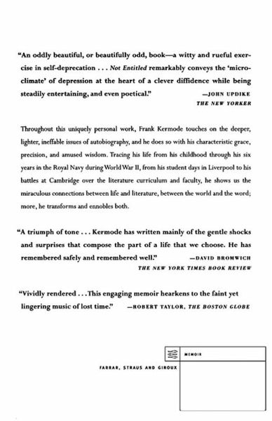 From a great critic of english literature, a different kind of text: a luminous account of his own life. Throughout this uniquely personal work, Frank Kermode touches on the deeper, lighter, ineffable issues of autobiography, and he does so with his characteristic grace, precision, and amused wisdom. Tracing his life from his childhood through his six years in the Royal Navy during World War II, from his student days in Liverpool to his battles at Cambridge over the literature curriculum and faculty, he shows us the miraculous connections between life and literature, between the world and the word; more, he transforms and ennobles both.