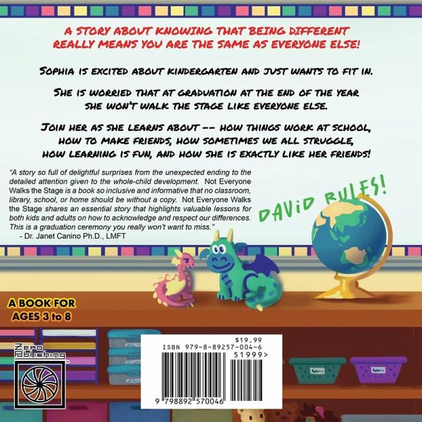 A STORY ABOUT KNOWING THAT BEING DIFFERENT REALLY MEANS YOU ARE THE SAME AS EVERYONE ELSE!Sophia is excited about kindergarten and just wants to fit in.She is worried that at graduation at the end of the year she won't walk the stage like everyone else. Join her as she learns about -- how things work at school, how to make friends, how sometimes we all struggle, how learning is fun, and how she is exactly like her friends! Sophia's has a mobility impairment that makes her think that she might not succeed in school. Her literal misunderstanding of "being able to walk the stage" at the end of the year worries her. We follow her journey through her first year in school, where we discover that her experiences are identical to all other students. Sophia's wheelchair is hidden in the book until the very end to emphasize her common experiences with other students. This wonderful book is perfect for all students to learn important broad lessons about how we are all the same, yet all different at the same time.The book includes an interview with author Sierra Andrews who herself is in a wheelchair due to a car accident at 18-years old. She gives information about being wheelchair-bound to parents, educators, and students. She answers questions people want to ask but are often afraid to do so. It also includes special sections called Can You Find, Other Ways to Use This Book, Fun Things to Do, and Fun Facts that give readers additional activities that they can do to learn and enjoy themselves. An interview with illustrator Alisa Tverdokhleb gives advice to those who want to be artists."A story so full of delightful surprises from the unexpected ending to the detailed attention given to the whole-child development.Not Everyone Walks the Stage is a book so inclusive and informative that no classroom, library, school, or home should be without a copy. Not Everyone Walks the Stage shares an essential story that highlights valuable lessons for both kids and adults on how to acknowledge and respect our differences.This is a graduation ceremony you really won't want to miss. Zepo Publishing takes the good that already exists in the world and amplifies it. A common thread in its books is its message of inclusion and acceptance of our individual differences that connect us in unique ways to one another." - Dr. Janet Canino Ph.D., LMFT