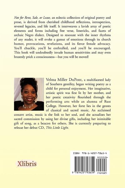 Not for Rent, Sale, or Lease, an eclectic collection of original poetry and prose, is derived from cherished childhood reflections, introspection, revered legacies, and life itself. It interweaves a lavish array of poetic elements and forms including free verse, limericks, and facets of archaic Negro dialect. Designed to resonate with the inner rhythms of any reader, it will evoke a gamut of emotions through its church humor, provocations, revelations, and its fierce female advocacy. You'll chuckle, you'll be enthralled, and you'll be encouraged. This book will undoubtedly invade human sensitivities and may even brazenly prick a consciousness-but you will be moved!