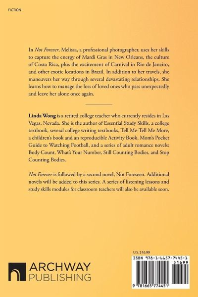 Linda Wong is a retired college teacher who currently resides in Las Vegas, Nevada. She is the author of Essential Study Skills, a college textbook, several college writing textbooks, Tell Me-Tell Me More, a children's book and an reproducible Activity Book, Mom's Pocket Guide to Watching Football, and a series of adult romance novels: Body Count, What's Your Number, Still Counting Bodies, and Stop Counting Bodies. Not Forever is followed by a second novel, Not Foreseen. Additional novels will be added to this series. A series of listening lessons and study skills modules for classroom teachers will also be available soon.