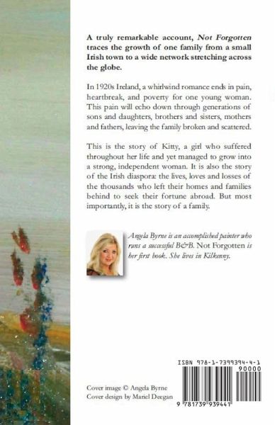 A truly remarkable account, Not Forgotten traces the growth of one family from a small Irish town to a wide network stretching across the globe. From 1820 to 1860,nearly two million Irish migrated to the United States, mostly due to the Great Irish Famine of 1845-1852. Many died crossing the ocean due to disease and dismal conditions of what became known as coffin ships. Not Forgotten is the story of love and loss, enchantment and despair, joy and sorrow. Nora Brown was smitten when she met Oliver McManus. After fathering six children with Nora, Oliver disappeared, joining the Irish Brotherhood and leaving his family behind, he never returned. Behind in 1920s Ireland, the whirlwind romance and marriage ends in pain,heartbreak and poverty for Nora Brown. This pain will echo down through generations of sons and daughters, brothers and sisters, mothers and fathers, leaving the family broken and scattered. Broken hearted and lost, Nora never lost hope of finding her beloved Oliver. Conversely, one daughter named Kitty wanted only to find him to put him in his place. Years passed and much of the family migrated to Canada and the United States. Kitty found her true love, who aided in her quest to find "the man her mother married." This is the story of Nora's daughter, Kitty, a girl whose suffering propelled her to grow into a strong, independent woman, feisty and capable. Kitty broke many rules of society with her unwillingness to conform but was highly regarded by all who knew this gifted woman. This reveals the story of the Irish diaspora: the lives, loves and losses of the thousands who left their homes and families behind to seek their fortune abroad. But most importantly, it is the story of a family.