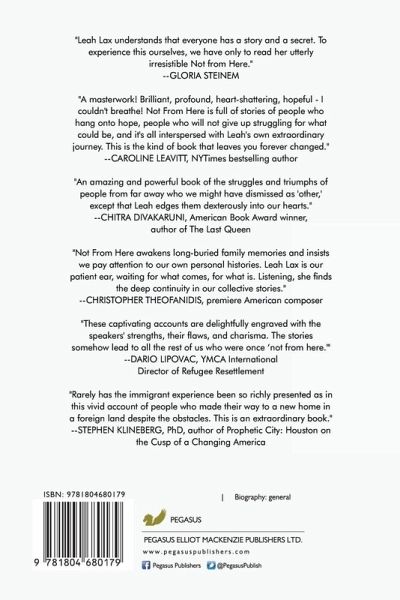Kirkus Starred Review * BlueInk Starred Review * Midwest Book Review Book of the Month * Houston Chronicle Sunday Feature "In a time of polarization about immigration, Not From Here affords a much-needed deep breath." Kirkus "Top recommendation to libraries and readers for its ability to shake the very foundations of modern belief." Midwest Book Review "Amid so much tumult in their lives, Lax repeatedly found not just resilience, but optimism." Houston Chronicle "Her depth of feeling for the topic is extremely powerful." BlueInk "In between seven amazing stories, the author discovers the story of her own family. The immigrant experience, she says, is the story of America." Jewish Book Council "An epic inquiry." - Booklist When Leah Lax was asked to write an opera to celebrate local immigrants, she began by spending a year listening to accounts of upheaval, migration, and arrival told her in confidence by people from around the globe. She felt she had discovered America, found its great beating heart. In interludes between the astounding and powerful stories in Not From Here, Leah uncovers the lost history of her Jewish family and finds a larger context for her own story. "In a way," she writes, "we Americans are all immigrants." Leah has had a dual career as an author and librettist. Her previous book Uncovered: How I Left Hasidic Life and Finally Came Home was the first gay memoir ever to come out of the Jewish ultraOrthodox world, now a modern opera by composer Lori Laitman. "Leah Lax understands that everyone has a story and a secret. To experience this ourselves, we have only to read her utterly irresistible Not from Here." --GLORIA STEINEM "A masterwork! Brilliant, profound, heart-shattering, hopeful - I couldn't breathe! Not From Here is full of stories of people who hang onto hope, people who will not give up struggling for what could be, and it's all interspersed with Leah's own extraordinary journey. This is the kind of book that leaves you forever changed." --CAROLINE LEAVITT, NYTimes bestselling author "An amazing and powerful book of the struggles and triumphs of people from far away who we might have dismissed as 'other, ' except that Leah edges them dexterously into our hearts." --CHITRA DIVAKARUNI, American Book Award winner, author of The Last Queen