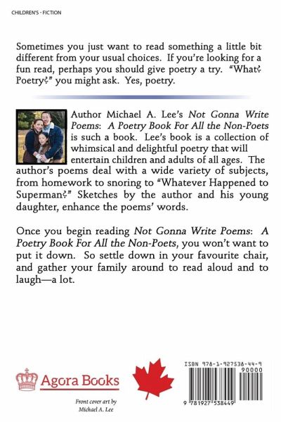 Michael Lee began writing poetry while he was in high school in Brooklyn, NY. Dr. Lee's new book, Not Gonna Write Poems, is his first endeavour as a poetry book author. His book is a collection of funny, unique poems and sketches meant to be shared and enjoyed by both adults and children of all ages. Inspired by his family's love of poetry, specifically the poetry of Shel Silverstein, Dr. Lee wrote his book in hopes of entertaining his family- and hopefully his readers as well. When not writing poetry, Dr. Lee works as a full time physician at an urgent care centre in Long Island, New York. In his free time, he loves to travel, work out, and spend time with his wife, Silvia, and his 10 year old daughter, Jessica.