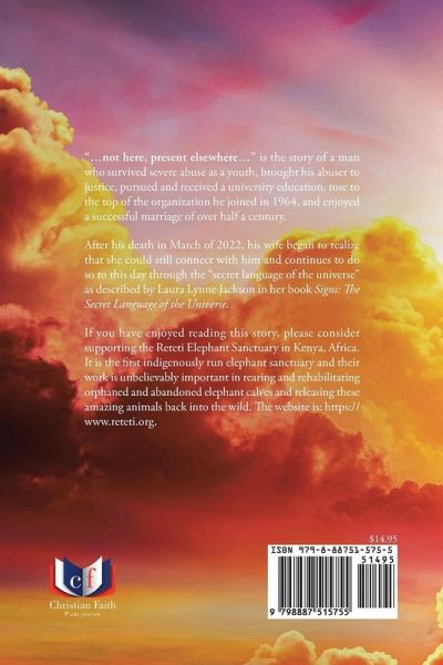 "...not here, present elsewhere..." is the story of a man who survived severe abuse as a youth, brought his abuser to justice, pursued and received a university education, rose to the top of the organization he joined in 1964, and enjoyed a successful marriage of over half a century. After his death in March of 2022, his wife began to realize that she could still connect with him and continues to do so to this day through the "secret language of the universe" as described by Laura Lynne Jackson in her book Signs: The Secret Language of the Universe. If you have enjoyed reading this story, please consider supporting the Reteti Elephant Sanctuary in Kenya, Africa. It is the first indigenously run elephant sanctuary and their work is unbelievably important in rearing and rehabilitating orphaned and abandoned elephant calves and releasing these amazing animals back into the wild. The website is: https://www.reteti.org.