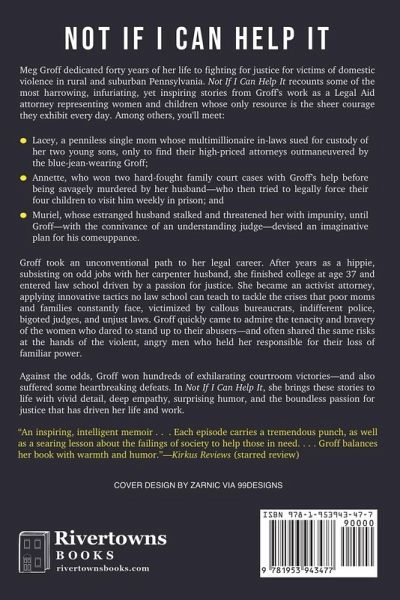 Meg Groff dedicated forty years of her life to fighting for justice for victims of domestic violence in rural and suburban Pennsylvania. Not If I Can Help It recounts some of the most harrowing, infuriating, yet inspiring stories from Groff's work as a Legal Aid attorney representing women and children whose only resource is the sheer courage they exhibit every day. Among others, you'll meet: Lacey, a penniless single mom whose multimillionaire in-laws sued for custody of her two young sons, only to find their high-priced attorneys outmaneuvered by the blue-jean-wearing Groff; Annette, who won two hard-fought family court cases with Groff's help before being savagely murdered by her husband-who then tried to legally force their four children to visit him weekly in prison; and Muriel, whose estranged husband stalked and threatened her with impunity, until Groff-with the connivance of an understanding judge-devised an imaginative plan for his comeuppance. Groff took an unconventional path to her legal career. After years as a hippie, subsisting on odd jobs with her carpenter husband, she finished college at age 37 and entered law school driven by a passion for justice. She became an activist attorney, applying innovative tactics no law school can teach to tackle the crises that poor moms and families constantly face, victimized by callous bureaucrats, indifferent police, bigoted judges, and unjust laws. Groff quickly came to admire the tenacity and bravery of the women who dared to stand up to their abusers-and often shared the same risks at the hands of the violent, angry men who held her responsible for their loss of familiar power. Against the odds, Groff won hundreds of exhilarating courtroom victories-and also suffered some heartbreaking defeats. In Not If I Can Help It, she brings these stories to life with vivid detail, deep empathy, surprising humor, and the boundless passion for justice that has driven her life and work. Readers who care about law, human rights, and the struggles of ordinary people will be captivated and inspired by this powerful book and the sobering insights it offers about the American way of justice.