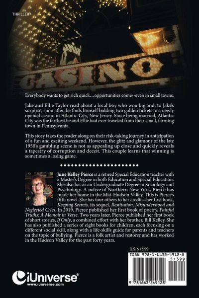 Everybody wants to get rich quick...opportunities come--even in small towns. Jake and Ellie Taylor read about a local boy who won big and, to Jake's surprise, soon after, he finds himself holding two golden tickets to a newly opened casino in Atlantic City, New Jersey. Atlantic City was the farthest he and Ellie had ever travelled from their small farming, town in Pennsylvania. This story takes the reader along on their risk-taking journey in anticipation of a fun and exciting weekend. However, the glitz and glamour of the late 1950's gambling scene is not as appealing up close and quickly reveals a tapestry of corruption and deceit. This couple learns that winning is sometimes a losing game.
