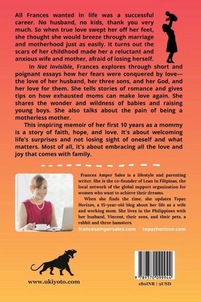All Frances wanted in life was a successful career. No husband, no kids, thank you very much. So when true love swept her off her feet, she thought she would breeze through marriage and motherhood just as easily. It turns out the scars of her childhood made her a reluctant and anxious wife and mother, afraid of losing herself. In Not Invisible, Frances explores through short and poignant essays how her fears were conquered by love - the love of her husband, her three sons, and her God, and her love for them. She tells stories of romance and gives tips on how exhausted moms can make love again. She shares the wonder and wildness of babies and raising young boys. She also talks about the pain of being a motherless mother. This inspiring memoir of her first 10 years as a mommy is a story of faith, hope, and love. It's about welcoming life's surprises and not losing sight of oneself and what matters. Most of all, it's about embracing all the love and joy that comes with family.