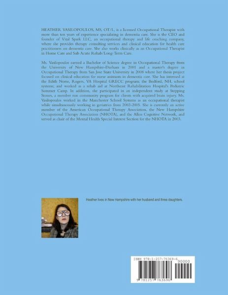 A humorous and intelligent discussion on caring for clients with dementing illness. The author, Heather Vasilopoulos MS OT/L, is a licensed Occupational Therapist and nationally recognized speaker on dementia care. Her thorough grasp of neurology and teaching method makes a difficult topic easy to understand.