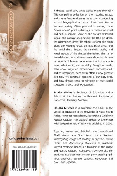 Contents: Sandra Weber/Claudia Mitchell: «Dress Stories» - Lorri Neilson Glenn: That Saturday night all her clothes fell apart and broke into song - Carol Mavor: Collecting Loss: Photographs, Dresses, «Paperies» - Kathleen O'Reilly Scanlon: Communion Dress Violations - Catherine Derry: «I'll Never Find a Dress»: Shopping for the Prom - Sandra Weber: No Red Shoes - Sandra Weber: Boxed-in by My School Uniform - Lyse Lemieux: Tunique Desires - Candis Steenbergen: In Front of the Closet: (Ad)dressing the Academic - Claudia Mitchell: Was It Something I Wore? - Madeleine R. Grumet: My Green Robe: Scholae Personae - Sandra Weber: Curse You Descartes! My Academic Gown - Lorri Neilson Glenn: Basic Black: A Wardrobe Primer for Seasoned Academic Women - Annette Kuhn: A Credit to Her Mother - Jennifer Musial: Fashioning Pregnancy: The Maternity Dress in Clothing Catalogues - Ardra L. Cole: The Christmas Doll - Gary Knowles: Constraining Mother: Corsetry, Control, and Comfort - Celeste Snowber: (Wo)man Time and M(other) Sins - Claudia Mitchell: Bridesmaid dress: Thick Description - Kathryn Church: Try This One On for Size: Poetic Notes from Wedding Dress Research - Jo Visser: Nailing It: My Wedding Dress - Xiao Lan Curdt-Christiansen: Made in China - Roksana Bahramitash: Revealing Veiling and Unveiling - Joan Reider: Scarf Signatures - Liz Ralfe: Love Affair with My Isishweshwe - Charlotte Hussey: Fashion Statement - Lorri Neilson Glenn: At the Ugly Ducklings Anonymous Meeting - Celeste Snowber: Writing Bare-breasted - Ilana Abramovitch: Not Just Any Little Black Dress - Claudia Mitchell: Dressing Death: Elsie Never Wore a Prom Dress - Kathy Sands: Fashion for the Soul - Sandra Weber/Claudia Mitchell: Theorizing Dress Stories.