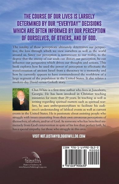 The course of our lives is largely determined by our "everyday" decisions which are often informed by our perception of ourselves, of others, and of God. The totality of these perceptions ultimately determines our perspective, the lens through which we view ourselves as well as the world around us. Since our perception is tantamount to our reality, to the degree that the enemy of our souls can distort our perception, he can influence our perspective which drives our thoughts and actions. This book explores how he used the power of perception to effectuate the transformation of ancient Israel from a theocracy to a monarchy and how he currently appears to have commandeered the worldview of a large segment of the population in the United States. It also examines the role of perception in our relationships with others as well as with God. Finally, in an effort to demonstrate that God is the same yesterday, today, and forever, it relates a modern-day David and Goliath story. Visit notjustanyoldgodwilldo.com