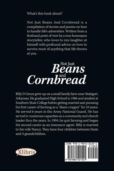 Whats this book about? Not Just Beans and Cornbread is a compilation of stories and poems on how to handle lifes adversities. This was written from a firsthand point of view by a true homespun storyteller, who loves to mix laughter at himself with profound advice on how to survive most of anything that life throws at you.