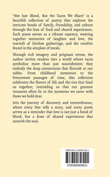 "Not Just Blood, But the Tacos We Share" is a heartfelt collection of poetry that explores the intricate bonds of family, friendship, and culture through the lens of food and shared experiences. Each poem serves as a vibrant tapestry, weaving together memories of laughter and love, the warmth of kitchen gatherings, and the comfort found in the simplest of meals. Through rich imagery and poignant verses, the author invites readers into a world where tacos symbolize more than just nourishment; they embody the deep connections that flourish at our tables. From childhood memories to the bittersweet passages of time, this collection celebrates the flavors of life and the ties that bind us together, reminding us that our greatest treasures often lie in the moments we savor with those we hold dear. Join the journey of discovery and remembrance, where every bite tells a story, and every poem serves as a reminder that love is not just a bond of blood, but a feast of shared experiences that nourish the soul.