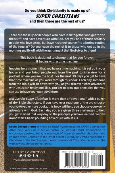 Do you think Christianity is made up of Super-Christians and then the rest of us? There are those "special" people who have it all together and get to have adventure with God. Are you one of those "ordinary" people who love Jesus, but have resigned yourself to a boring routine of the regular? This book is designed to change that for you forever. Imagine for a moment that you have a time machine. It is set up in your house and you bring people out from the past to interview for a podcast that you are the host. For the next 30 days you get to have that time machine as you work through this book. Each day someone from the Bible will sit down with you as you discover what adventure with Jesus can really look like. But this is more than just a "devotional" with a bunch of dry Bible characters. If you have ever read one of the old "choose your own adventure" books this book is here to help you choose your own adventure with God. So dive in and start a heart pounding adventure with Jesus.