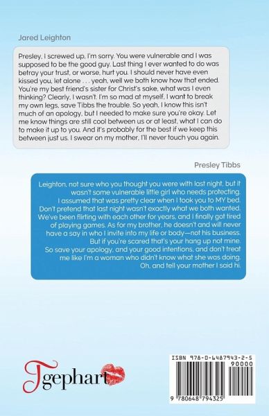 Jared Leighton-Presley, I screwed up, I'm sorry. You were vulnerable and I was supposed to be the good guy. Last thing I ever wanted to do was betray your trust, or worse, hurt you. I should never have even kissed you, let alone . . . yeah, well we both know how that ended. You're my best friend's sister for Christ's sake, what was I even thinking? Clearly, I wasn't. I'm so mad at myself, I want to break my own legs, save Tibbs the trouble. So yeah, I know this isn't much of an apology, but I needed to make sure you're okay. Let me know things are still cool between us or at least, what I can do to make it up to you. And it's probably for the best if we keep this between just us. I swear on my mother, I'll never touch you again. Presley Tibbs-Leighton, not sure who you thought you were with last night, but it wasn't some vulnerable little girl who needs protecting. I assumed that was pretty clear when I took you to MY bed. Don't pretend that last night wasn't exactly what we both wanted. We've been flirting with each other for years, and I finally got tired of playing games. As for my brother, he doesn't and will never have a say in who I invite into my life or body-not his business. But if you're scared that's your hang up not mine. So save your apology, and your good intentions, and don't treat me like I'm a woman who didn't know what she was doing. Oh, and tell your mother I said hi.