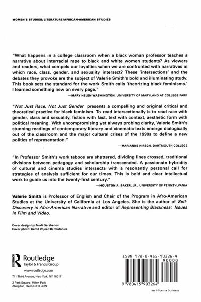 From the nineteenth century articulations of Sojourner Truth to contemporary thinkers like Patricia J. Williams, Black feminists have always recognized the mutual dependence of race and gender. Detailing these connections, Not Just Race, Not Just Gender explores the myriad ways race and gender shape lives and social practices. Resisting essentialist tendencies, Valerie Smith identifies black feminist theorizing as a strategy of reading rather than located in a particular subjective experience. Her intent is not to deny the validity of black women's lived experience, but rather to resist deploying a uniform model of black women's lives that actually undermines the power of black feminist thought. Whether reading race or gender in the Central Park jogger case or in contemporary media, like Livin' Large, Smith displays critical rigor that promises to change the way we think about race and gender.