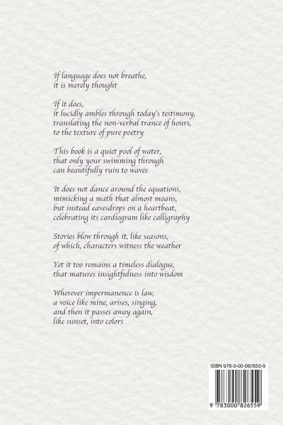 If language does not breathe, it is merely thought. If it does, it lucidly ambles through today's testimony, translating the non-verbal trance of hours to the texture of pure poetry. This book is a quiet pool of water, that only your swimming through, can beautifully ruin to waves. It does not dance around the equations, mimicking a math that almost moans. But instead eavesdrops on a heartbeat, celebrating its cardiogram like calligraphy. Stories blow through it, like seasons, of which characters witness the weather. Yet it too remains a timeless dialogue, that matures insightfulness into wisdom. Wherever impermanence is law, a voice like mine, arises, singing. And then it passes away again, like sunset, into colors.