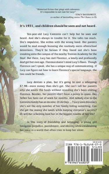 It's 1931, and children should be seen and not heard. Ten-year-old Lucy Contento can't help but be seen and heard. And she's always in trouble for it. She talks too much. She's impulsive. She writes with the wrong hand. Her parents would be mad enough knowing she routinely earns afterschool detentions. They'd be furious if they found out she's been sneaking onto the campus of the nearby Trenton Academy for the Deaf. But there, Lucy has met Florence, a lonely and profoundly deaf girl her own age. Florence doesn't mind Lucy's flaws. Though Florence can't speak, she has a unique way of communicating. If Lucy can figure out how to learn Florence's special language, the two could be friends. Lucy devises a plan, but it's going to cost a whopping $7.98-more money than she's got. She can't tell her parents why she wants the funds without revealing she's been visiting Florence. Besides, her parents don't have a penny to spare. Her father has been out of work for months. And nobody else in the Contento family has an income. Or do they ...? Lucy soon discovers she's not the only member of her family hiding something. Can she get the money she needs while keeping everyone's secrets? Or will her scheming land her in the biggest trouble of her life? In this story of friendship and belonging, a young girl navigates prejudice, punishment, and identity while establishing her voice in a world that often tries to keep her silent.