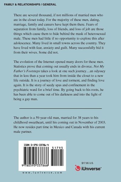 There are several thousand, if not millions of married men who are in the closet today. For the majority of these men, dating, marriage, family and careers have kept them there. Fears of separation from family, loss of friends, and loss of job are those things which cause them to hide behind the mask of heterosexual male. These men had little if no opportunity to explore this after adolescence. Many lived in small towns across the country. They have lived with fear, anxiety and guilt. Many successfully hid it from their wives. Some did not. The evolution of the Internet opened many doors for these men. Statistics prove that coming out usually ends in divorce. Not My Father's Footsteps takes a look at one such journey...an odyssey that in less than a year took him from inside the closet to a new life outside. It is a journey of love and torment, and finding love again. It is the story of seedy spas and confinement in the psychiatric ward for a brief time. By going back to his roots, he has been able to come out of his darkness and into the light of being a gay man.