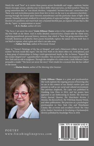 Not My First Walk on the Moon takes the reader on a journey through time and geographies. It moves through seasons and generations, through cityscapes, seashore, barrier islands, and backyards. The poems reflect on loss and how it reverberates throughout a lifetime including the tiny but continual losses of aging. They also celebrate moments of joy and awe inspired by breeze, light and love. Many of the poems use a framework of visual art and imagery-including a mother's love of Turner's Paintings of the Sea at Margate, a crime scene photo in which the facts fail to tell the story, and a portrait of a family leaving Rockaway beach in late afternoon. The moon slips in and out these poems but takes center stage in one as the author recalls watching the 1969 moon landing and imagines her very own walk on the "moon's luminescent dustscape".