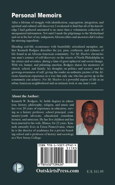 Not My Shadow is a powerful expose of family life in an urban African American community. Blending real life occurrences with wonderfully intellectual metaphor the author articulately describes the joy, pain, confusion, and riches of his all to real experiences. Experiences that are mirrored in communities across the America! The reader will be captivated in the journey through church, school, parenting, political thought, and African American sociology while touched with wit, humor, and pulsating emotions of the realities of the African American duality. Travel with the author through the streets of the community meeting childhood friends, family, and neighbors, and watch their dreams, hopes and aspirations develop, and often be devoured by poverty, racism, and their own misgivings. Walk with the author through an authentic Sunday church service witnessing the marches, preaching, choirs, and activities that depict the African American religious experience. Attend a day of school, and be transposed by the author's imagery into a student in a typical urban school setting. Kenneth Rodgers offers this and more in his autobiographical journey through the streets of North Philadelphia in the 1960's and 70's when America was at its height of social change. Not My Shadow uses is accounts of professional and community life experiences with suggestions and ideas as to healing processes for the African American community, and possibly a guide of sorts for those outside that community that seek to better understand it. While powerfully intellectual but not complicated with data and research jargon, the text is eloquently storied, and positioned with usable ideas for real life applications. A true learning experience, and authentic recounting of African American urban lifestyle as experienced by a man born and raised in a major northern city, by a southern fundamentally Christian family. A must read for anyone interested in the real human story of a sociology intricately woven into the American community.