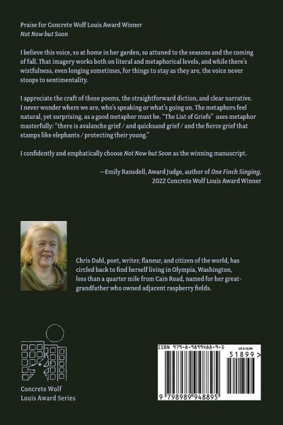 I imagine the moment before / that moment we can never go back to, the poet tells us in this collection about the spaces between, the verges. These verses fulfill what poetry is meant to express: emotion beyond definition, like the ache of longing to slow down time. Dahl uses cats, figs, polar bears, aging parents to hint at the heaven you have never been able to chart. She wakes the wild in all of us that longs to range fast and far / through what I can see and into / what I cannot even imagine. -Joanne M. Clarkson, author of The Fates and Hospice House Chris Dahl's Not Now But Soon foreshadows and forecasts minute and monumental griefs and joys as they also simultaneously reach into metaphor and memory to reflect what has come to pass. The poems accumulate their meanings like snow-the satisfying kind that sticks and so delights in the Pacific Northwest-even as it causes daily, generational hazards. This collection's intimacy of the familial set against the seasonal generates a compelling, cyclical read. -Sandra Yannone, author of Boats for Women and The Glass Studio I believe this voice, so at home in her garden, so attuned to the seasons and the coming of fall. That imagery works both on literal and metaphorical levels, and while there's wistfulness, even longing sometimes, for things to stay as they are, the voice never stoops to sentimentality. I appreciate the craft of these poems, the straightforward diction, and clear narrative. I never wonder where we are, who's speaking or what's going on. The metaphors feel natural, yet surprising, as a good metaphor must be. "The List of Griefs" uses metaphor masterfully: "there is avalanche grief / and quicksand grief / and the fierce grief that stamps like elephants / protecting their young." I confidently and emphatically choose Not Now but Soon as the winning manuscript. -Emily Ransdell, Award Judge, author of One Finch Singing, 2022 Concrete Wolf Louis Award Winner