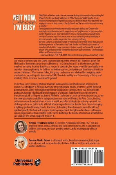 Are you or is someone you love facing a cancer diagnosis in the prime of life? You're not alone. The likelihood of developing cancer in one's lifetime is 1 in 2 for males and 1 in 3 for females, and the numbers are rising. A cancer diagnosis at any age is traumatic, but young to middle-aged adults who are often raising or planning for children, establishing careers, and getting on their financial feet face unique challenges. When cancer strikes, this group can become overwhelmed by navigating treatment options, mounting debt from medical bills, threats to fertility, and the necessity of facing one's mortality. It can become a mental battle ground. In Not Now, Cancer, I'm Busy, Melissa Trevathan-Minnis and Deanne Meeks Brown offer research, resources, and support to help you overcome the psychological trauma of cancer. Sharing their own personal stories, along with insights from other young cancer survivors, these two mental health professionals guide you through the rollercoaster of emotions from diagnosis and treatment to transitioning back to life post-treatment. While the challenges of cancer survivorship are many, so are the coping strategies available to help promote recovery and well-being. Not Now, Cancer, I'm Busy, addresses cancer through the lens of mental health and offers strategies to not only cope with the challenges of cancer, but to build a life full of meaning and intention despite them. From developing a fighting spirit and learning how to slow down, to breaking down barriers to mental health and spiritual growth, this book will help you tap into your personal strengths and resilience. Although a cancer diagnosis in early and midlife can be earth-shattering, the trauma of cancer can actually leave you stronger and better equipped-if you let it.
