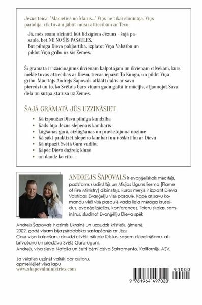 J¿zus teica: "M¿cieties no Manis..." Vi¿ ne tikai sludin¿ja, Vi¿ par¿d¿ja, cik tuv¿m j¿b¿t m¿su attiec¿b¿m ar T¿vu. J¿, m¿s esam aicin¿ti b¿t l¿dz¿giem J¿zum - aj¿ pasaul¿, bet NE NO ¿S PASAULES, B¿t piln¿g¿ Dieva pak¿aut¿b¿, izplatot Vi¿a Valst¿bu un pildot Vi¿a gribu uz ¿s Zemes. ¿ gr¿mata ir izaicin¿jums ikvienam kalpot¿jam un ikvienam cilv¿kam, kur mekl¿ tuvas attiec¿bas ar Dievu, tiecas iepaz¿t To Kungu, un pild¿t Vi¿a gribu. M¿c¿t¿js Andrejs apovals atkl¿ti dal¿s ar savu pieredzi un to, ko Sv¿tais Gars vi¿am gadu gait¿ ir m¿c¿jis, atjaunojot Sava d¿la un s¿t¿a status¿ uz Zemes. aj¿ gr¿mat¿ j¿s uzzin¿siet ¿ K¿ izpauas Dieva piln¿ga kundz¿ba ¿ K¿ds bija J¿zus slepenais kambaris ¿ L¿ganas gar¿, aizl¿ganas un pravietojuma noz¿me ¿ K¿ s¿kt praktiz¿t slepeno kambari un no¿irt¿bu ar Dievu ¿ K¿ atpaz¿t Sv¿t¿ Gara vad¿bu ¿ K¿p¿c Dievs dareiz klus¿ ¿ un daudz ko citu... Andrejs apovals ir evä¿¿liskais m¿c¿t¿js, paz¿stams sludin¿t¿js un Misijas Uguns liesma [Flame of Fire Ministry] dibin¿t¿js, kuras m¿r¿is ir izplat¿t Dieva Valst¿bas Evä¿¿liju vis¿ pasaul¿. Kop¿ ar savu komandu vi¿ vis¿ pasaul¿ vada liela m¿roga kruse¿dus, evä¿eliz¿cijas, konferences, l¿deru skolas, semin¿rus, sludinot Evan¿¿liju Dieva sp¿k¿. Andrejs apovals ir dzimis Ukrain¿ un uzaudzis kristieu ¿imen¿. 2002. gad¿ vi¿am bija p¿rdabiska sastapan¿s ar J¿zu. Caur vi¿a kalpoanu daudzi cilv¿ki n¿k pie Kristus, säem dziedin¿anu, atbr¿voanu un piedz¿vo Sv¿t¿ Gara uguni. Andrejs, vi¿a sieva Nataa un ¿etri b¿rni dz¿vo Sakramento, Kalifornij¿, ASV. Ja v¿laties uzzin¿t vair¿k par autoru, apmekl¿jiet vi¿a lapu www.shapovalministries.com