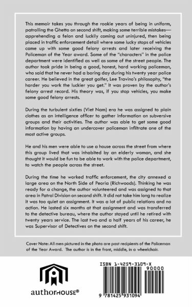 This memoir takes you through the rookie years of being in uniform, patrolling the Ghetto on second shift, making some terrible mistakes-apprehending a felon and luckily coming out uninjured, then being placed in traffic enforcement detail where some lucky stops of vehicles came up with some good felony arrests and later receiving the Policeman of the Year award. Some of the "characters" in the police department were identified as well as some of the street people. The author took pride in being a good, honest, hard working policeman, who said that he never had a boring day during his twenty year police career. He believed in the great golfer, Lee Travino's philosophy, "the harder you work the luckier you get." It was proven by the author's felony arrest record. His theory was, if you stop vehicles, you make some good felony arrests. During the turbulent sixties (Viet Nam) era he was assigned to plain clothes as an intelligence officer to gather information on subversive groups and their activities. The author was able to get some good information by having an undercover policeman infiltrate one of the most active groups. He and his men were able to use a house across the street from where this group lived that was inhabited by an elderly woman, and she thought it would be fun to be able to work with the police department, to watch the people across the street. During the time he worked traffic enforcement, the city annexed a large area on the North Side of Peoria (Richwoods). Thinking he was ready for a change, the author volunteered and was assigned to that area in Patrol Division on second shift. It did not take him long to realize it was too quiet an assignment. It was a lot of public relations and no action. He lasted six months at that assignment and was transferred to the detective bureau, where the author stayed until he retired with twenty years service. The last two and half yearsof his career, he was supervisor on the second shift.