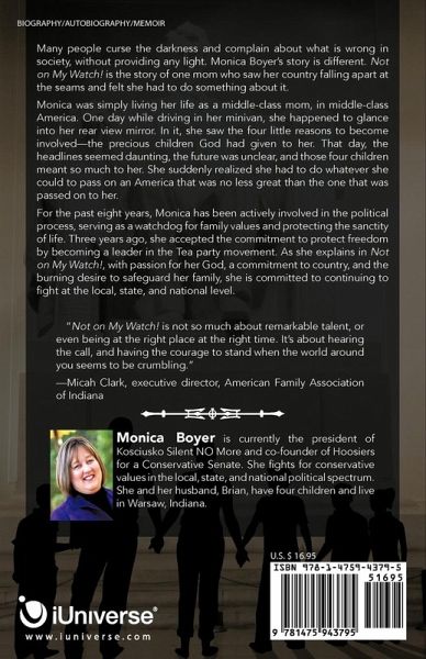Many people curse the darkness and complain about what is wrong in society, without providing any light. Monica Boyer's story is different. Not on My Watch is the story of one mom who saw her country falling apart at the seams and felt she had to do something about it. Monica was simply living her life as a middle-class mom, in middle-class America. One day while driving in her minivan, she happened to glance into her rear view mirror. In it, she saw the four little reasons to become involved-the precious children God had given to her. That day, the headlines seemed daunting, the future was unclear, and those four children meant so much to her. She suddenly realized she had to do whatever she could to pass on an America that was no less great than the one that was passed on to her. For the past eight years, Monica has been actively involved in the political process, serving as a watchdog for family values and protecting the sanctity of life. Three years ago, she accepted the commitment to protect freedom by becoming a leader in the TEA Party movement. As she explains in Not on My Watch, with passion for her God, a commitment to country, and the burning desire to safeguard her family, she is committed to continuing to fight at the local, state, and national level. "Not on My Watch is not so much about remarkable talent, or even being at the right place at the right time. It's about hearing the call, and having the courage to stand when the world around you seems to be crumbling." -Micah Clark, executive director, American Family Association of Indiana