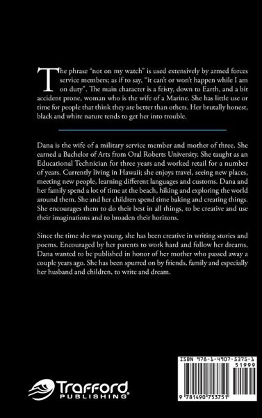 The phrase "not on my watch" is used extensively by armed forces service members; as if to say, "it can't or won't happen while I am on duty". The main character is a feisty, down to Earth, and a bit accident prone, woman who is the wife of a Marine. She has little use or time for people that think they are better than others. Her brutally honest, black and white nature tends to get her into trouble.